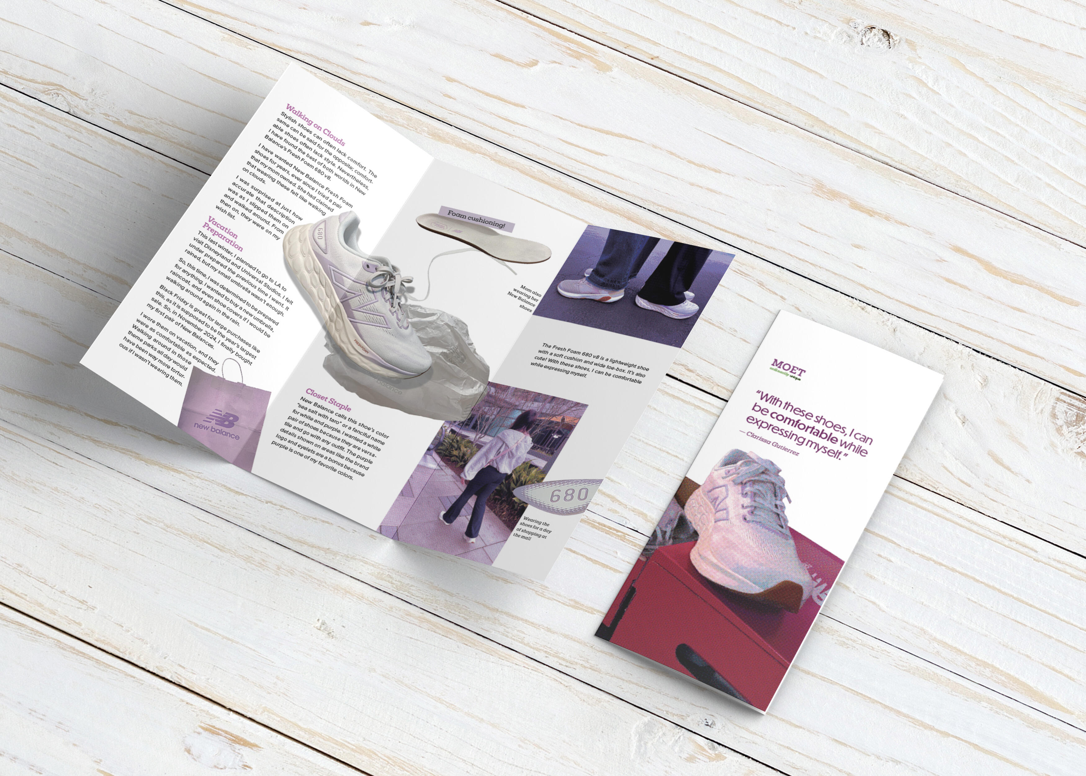 The objective of this project was to design a brochure for a museum exhibit featuring my favorite pair of shoes, the New Balance Fresh Foam 680 v8. The design goal was to use photography as the main design element.